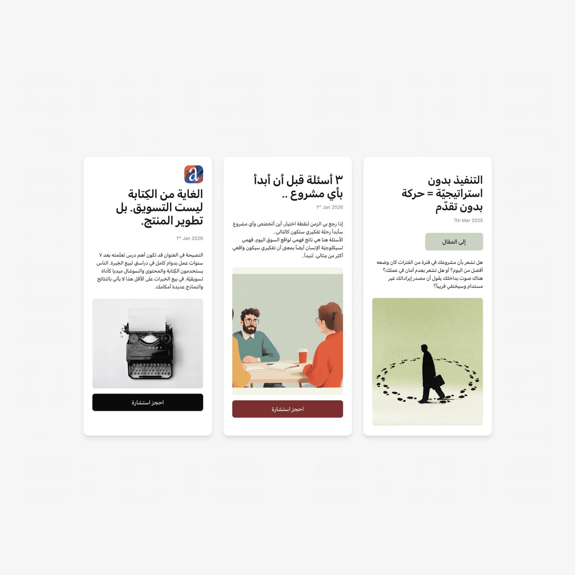 ومستعد أن تستثمر فيه وتعمل مع الأفضل؟ فرق شاسع ما بين بناء المشروع الاستشاري والتعامل معه كهواية. المشروع يتطلّب رؤية، تركيز وخطّة واضحة في التسويق والمُنتجات. يمكنك أن تعمل مع ٥٠٠ خبير في العالم العربي لتحصل على خبرتي أو يمكنك أن تحصل عليها مباشرة بالضغط على الزر أدناه.